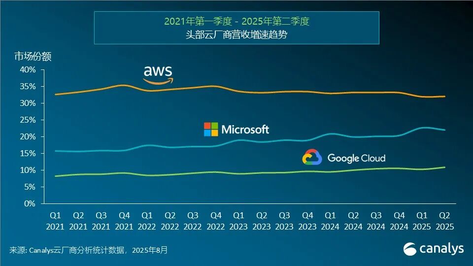 2025年第二季度,微软Azure和谷歌云的增速均大幅超过30%,而市场领导者AWS 的同比增长为17%,与上季度保持一致。但从营收规模来看,AWS的同比新增部分仍然高于微软Azure和谷歌云。