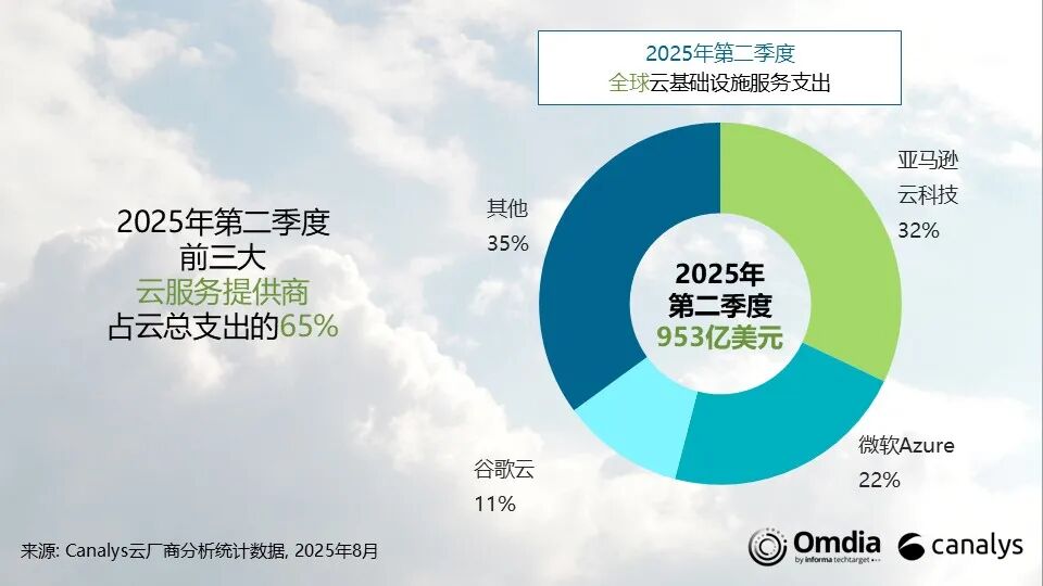 Canalys数据估计显示,2025年第二季度,全球云基础设施服务支出达到953亿美元,同比增长22%。市场增长势头依然稳健,已连续四个季度保持超过20%的同比增幅。云服务需求的增长主要受到三方面推动:AI使用量的提升、传统系统迁移的复苏,以及云原生业务的规模化发展。随着头部云厂商不断增强AI能力和应用,越来越多客户开始采用多模型策略,以更好地兼顾成本控制和特定场景需求。2025年第二季度,AWS、微软Azure和谷歌云保持了上季度的排名,三者合计占据全球云基础设施支出65%的市场份额。总体来看,头部三家厂商的整体收入同比增长27%。